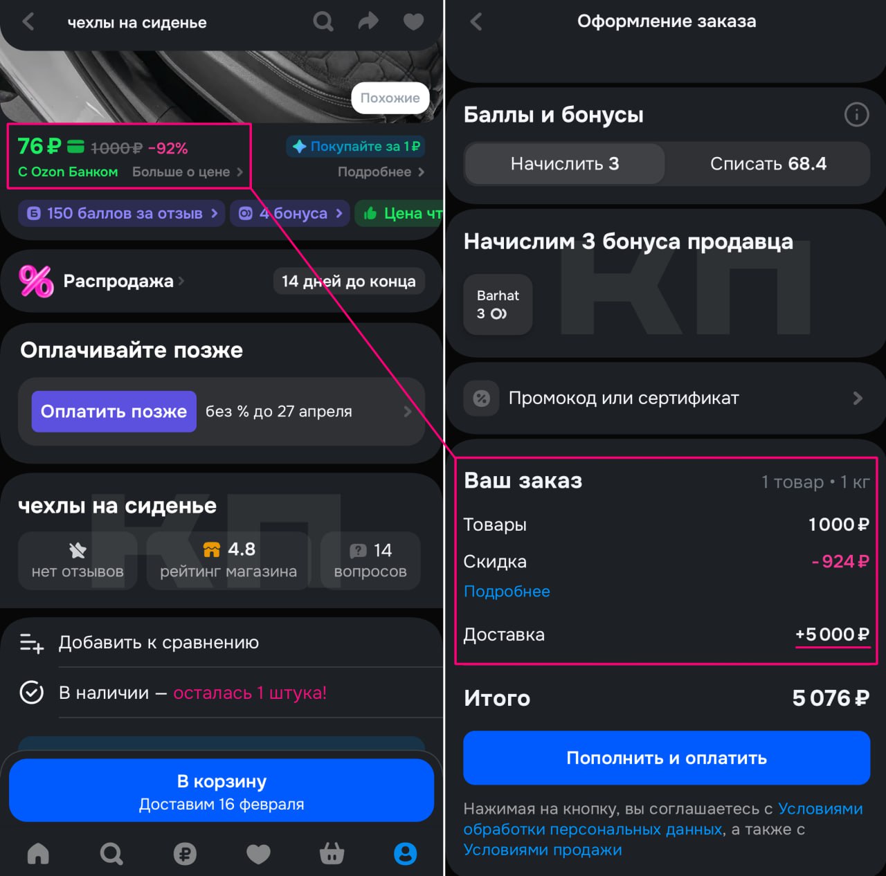 В Telegram-канале «Клуб партнеров на маркетплейсах» обнаружили интересного селлера. Он продает свой товар по максимально низкой цене, однако при этом стоимость доставки зашкаливает в любую точку. Продавец торгует чехлами на сиденья всего за 76 рублей. Но если радостный покупатель внимательно посмотрит в карточку или положит товар в корзину, то обнаружит, что к цене товара плюсуются фиксированные 5000 рублей за доставку. Механика в целом не новая, она была популярна на заре AliExpress. Да и сейчас там можно обнаружить такие товары. Почему же сейчас ее переоткрыли на Ozon? Разбираем плюсы и минусы схемы.