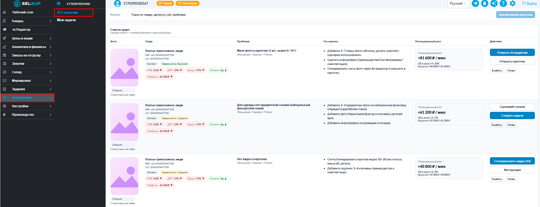 Внутри раздела АI стратегии по товарам, каждая задача оформлена одинаково и читается за секунды: