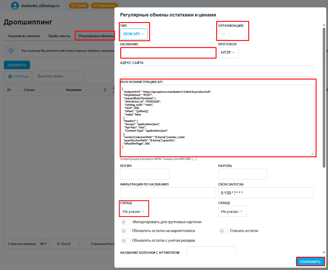 В SelSup также доступен импорт остатков через агрегатор API Core с использованием JSON API.