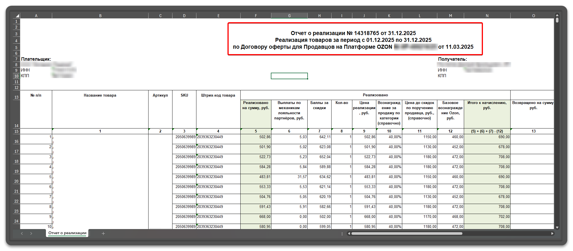 Ниже приведён пример месячного позаказного отчёта Ozon.