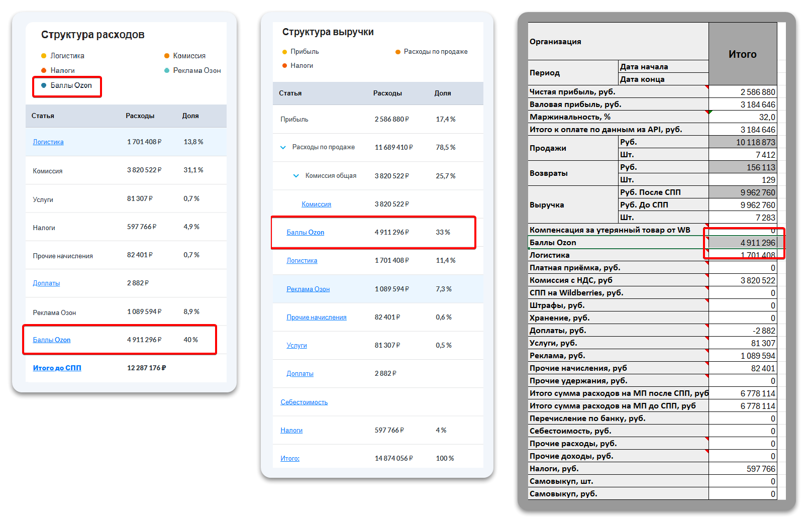 Это помогает полнее учитывать расходы и компенсации, если часть расчётов прошла баллами Ozon.