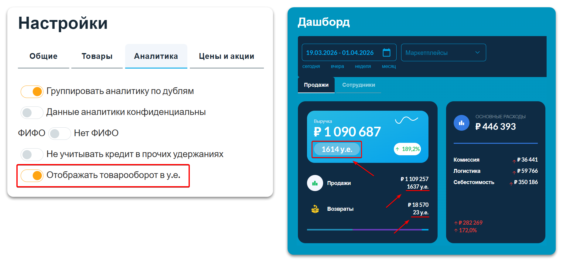 ВверхЕсли в разделе «Настройки → Аналитика» включить настройку «Отображать товарооборот в у.е.», на Дашборде дополнительно будет показываться аналитика товарооборота в условных единицах.