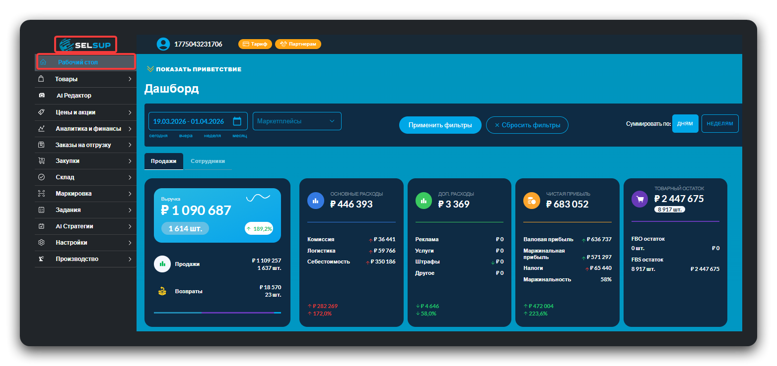 Дашборд - это инструмент для анализа всех данных кабинета продавца.