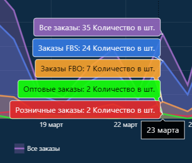 Если навести курсор на конкретный период, откроется разбивка заказов по каждому типу за выбранную дату.