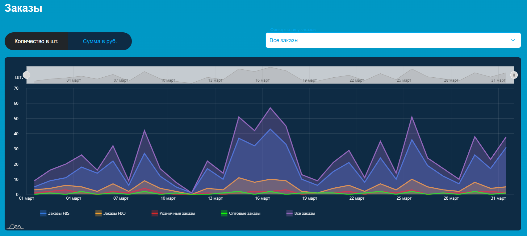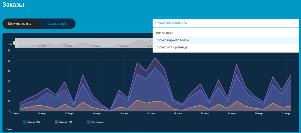 Если нужно посмотреть только определённые заказы, используйте фильтр над графиком: можно отдельно отобразить только заказы с маркетплейсов или только розничные и оптовые заказы.