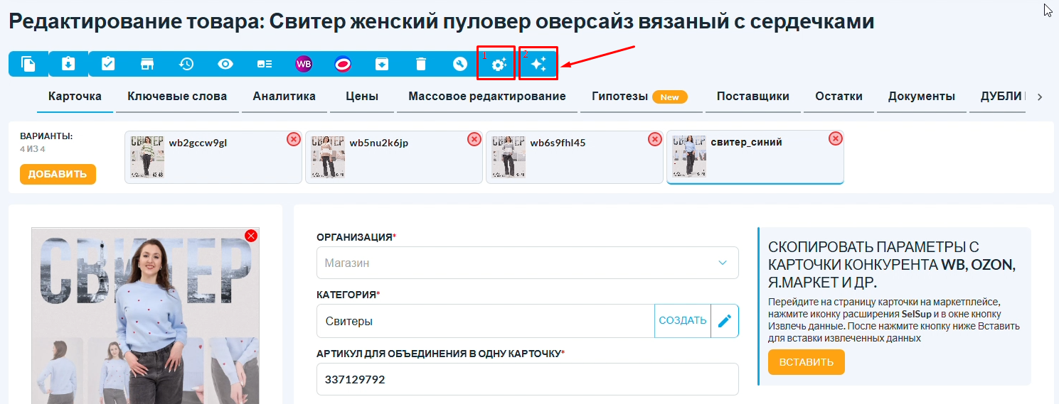 Анализ. Нажмите на кнопку с шестеренкой «Извлечь параметры». Наш интеллектуальный алгоритм просканирует информацию в карточке, поймет контекст и выделит ключевые атрибуты: материал, размеры, цвет, вес и десятки других параметров.