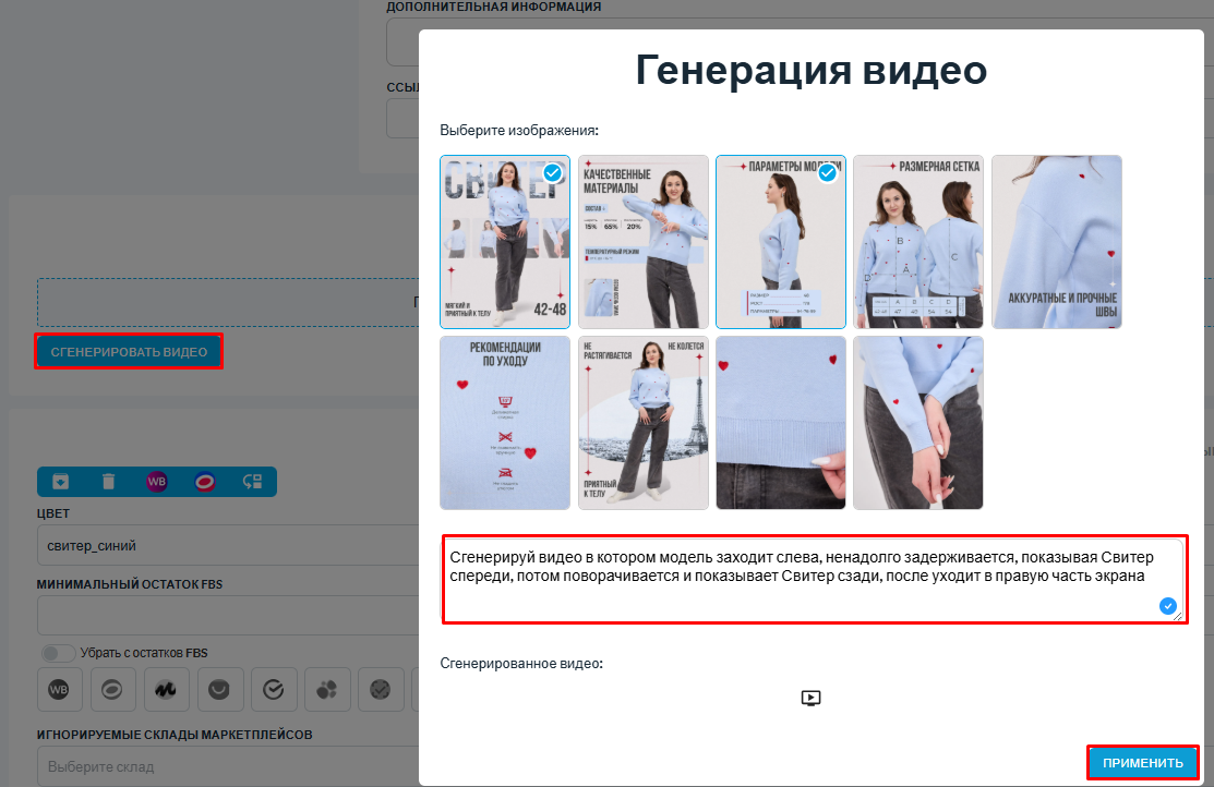 Сделайте ваши товары на маркетплейсах по-настоящему живыми! Мы добавили инновационную функцию — генерацию видео на основе фотографий с помощью искусственного интеллекта. Теперь вы можете создавать профессиональные видеоролики для карточек товаров, не прибегая к сложным программам монтажа.