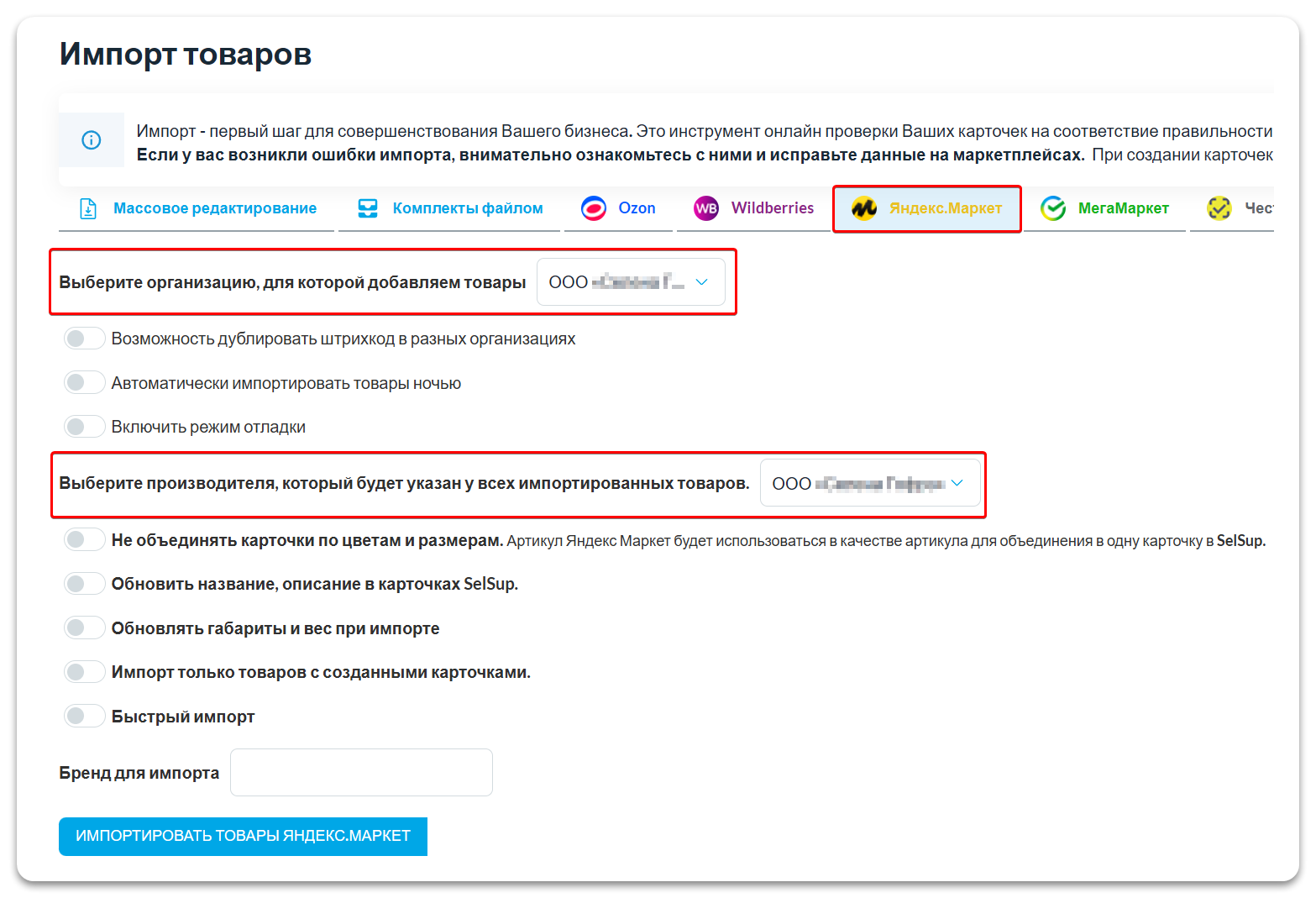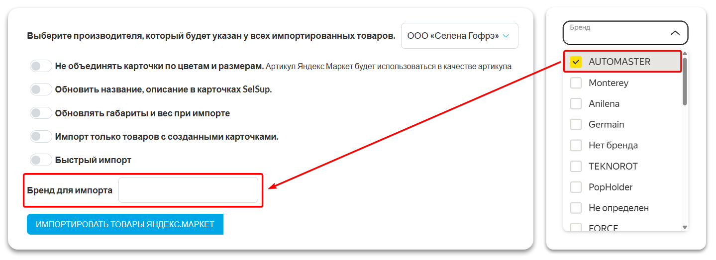 По умолчанию при импорте товаров в SelSup загружаются все товары из вашей библиотеки Яндекс.Маркета, включая товары всех брендов. Если вам нужно импортировать только товары определённых брендов, используйте поле «Бренд для импорта».