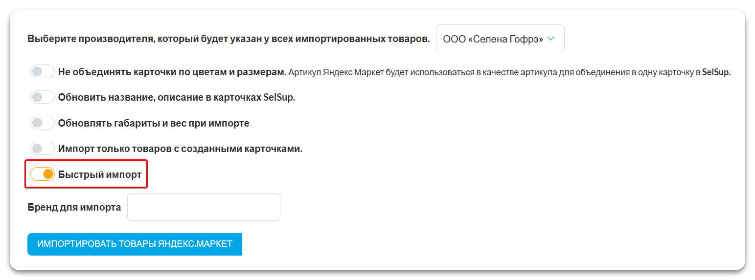 Включите тумблер Быстрый импорт, если вам нужно быстро загрузить новые товары. После включения SelSup будет импортировать только новые позиции, игнорируя уже существующие товары и не обновляя их.