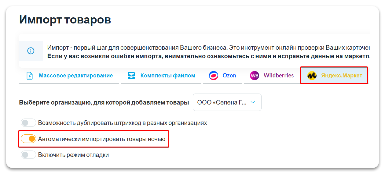 Если вы планируете создавать новые товары и обновлять уже существующие карточки из маркетплейса, включите функцию автоматического импорта товаров ночью на странице импорта товаров. Эта функция автоматически запускает импорт каждую ночь, обновляя данные в уже созданных товарах и добавляя новые товары, как при ручном импорте.