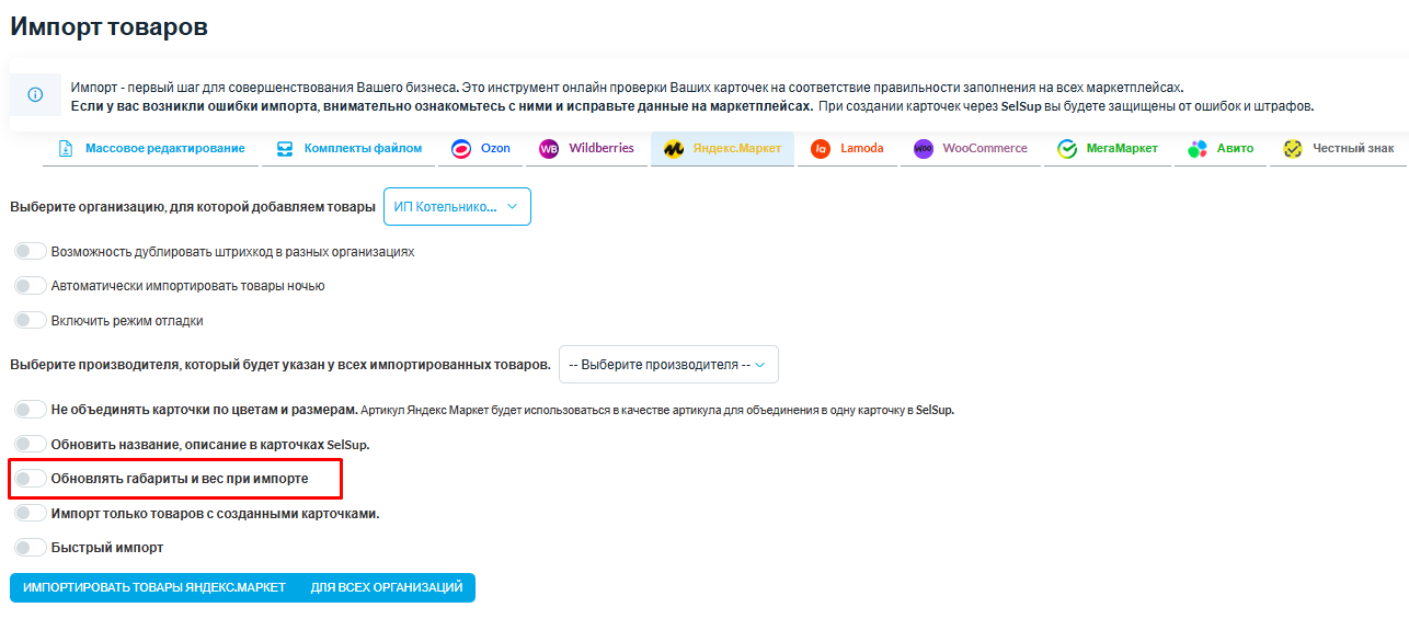 При включении данного тумблера Selsup будет автоматически обновлять габариты и вес товаров при импорте, если они отличаются от данных, указанных на маркетплейсе.