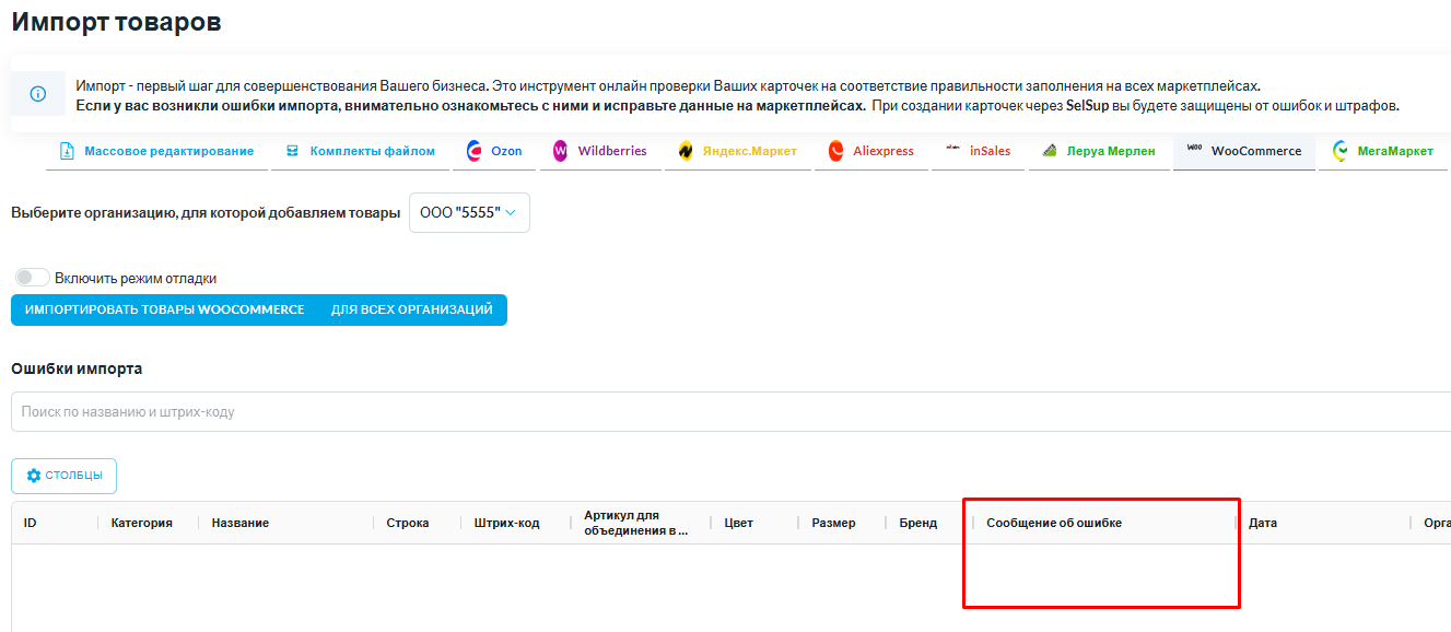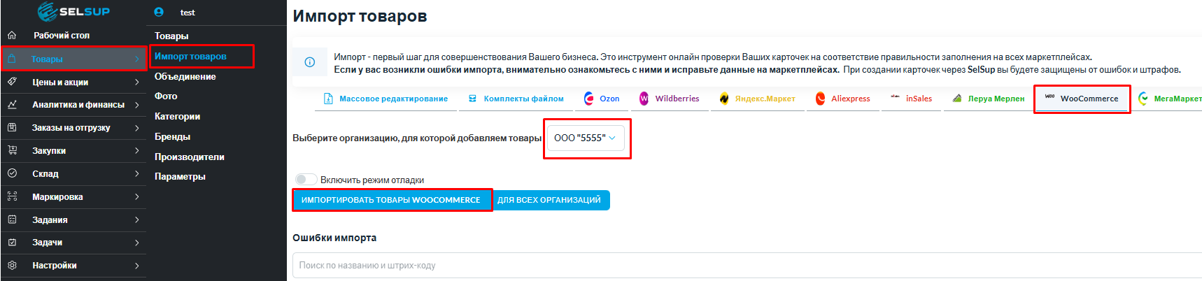Выберите организацию, для которой нужно выполнить импорт, и нажмите Импортировать товары сервиса WooCommerce.