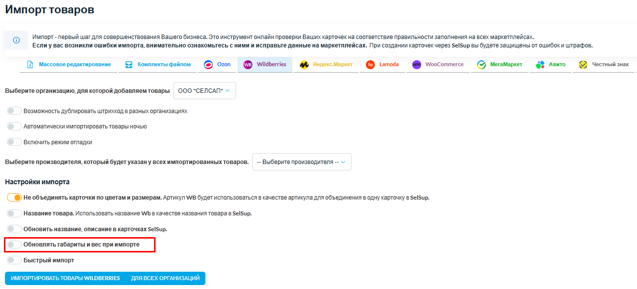 При включении данного тумблера Selsup будет автоматически обновлять габариты и вес товаров при импорте, если они отличаются от данных, указанных на маркетплейсе.