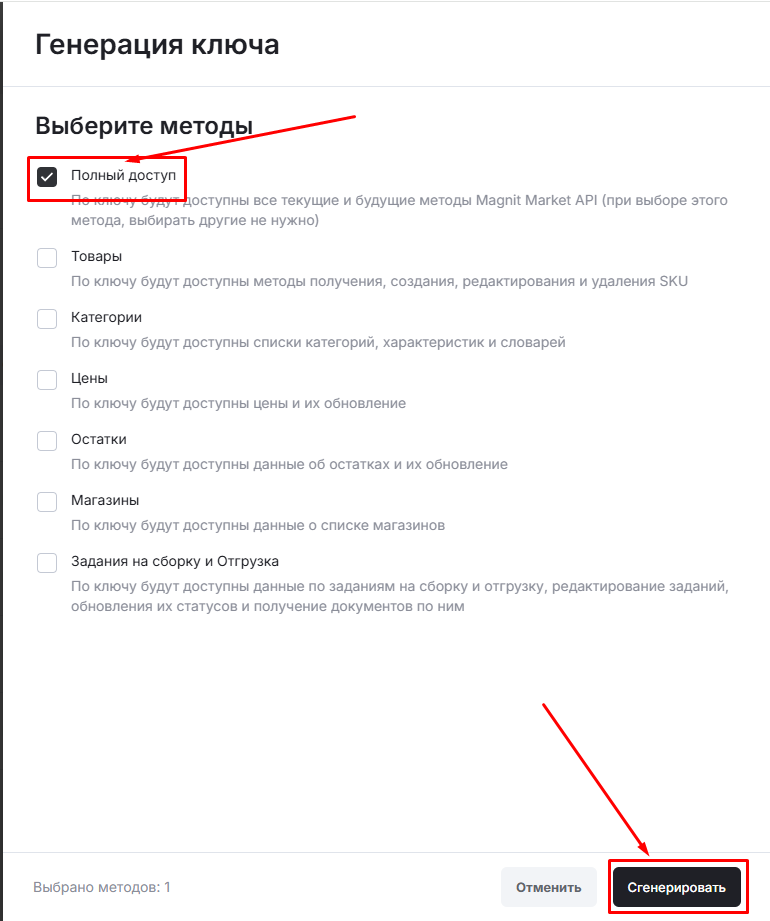 3. В открывшемся окне выберите тип доступа Полный доступ и подтвердите генерацию.