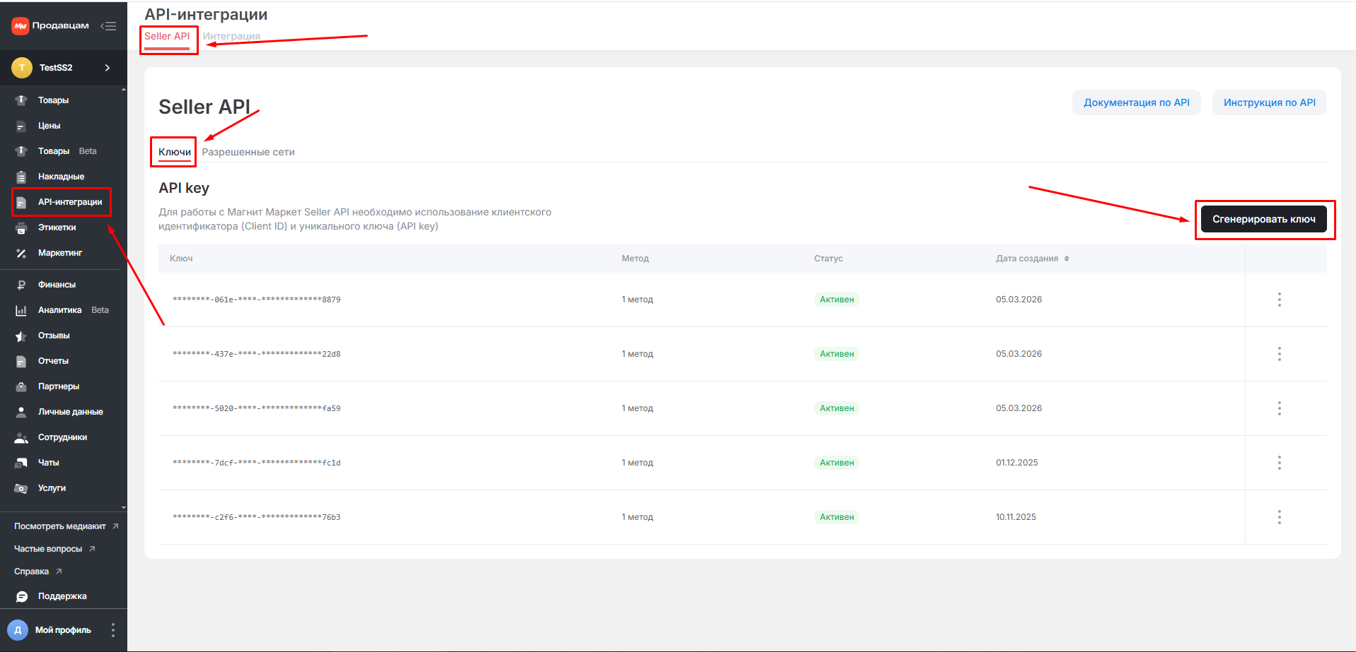 2. Откройте вкладку Seller API и нажмите кнопку Сгенерировать ключ.