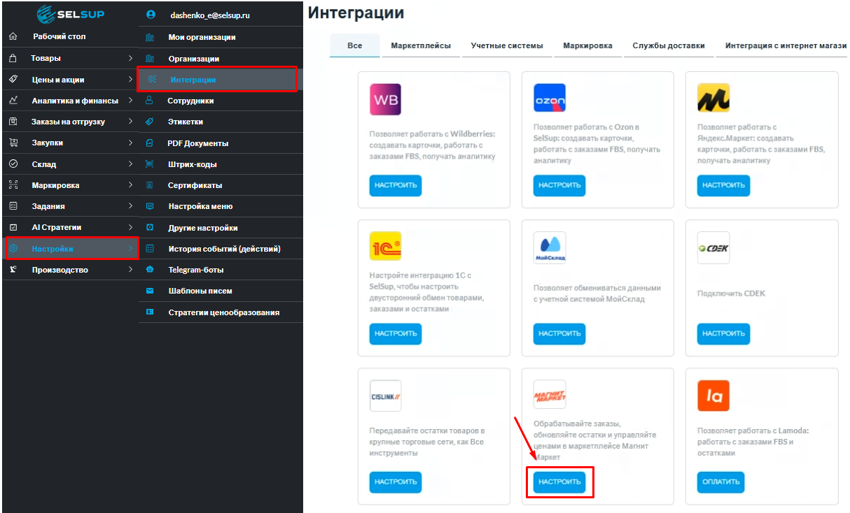 4. В SelSup перейдите в раздел Настройки → Интеграции.
