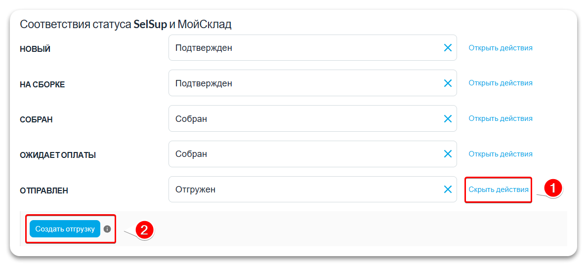 Когда заказ в SelSup переходит в статус «Собран», в «МойСклад» автоматически создается отгрузка.