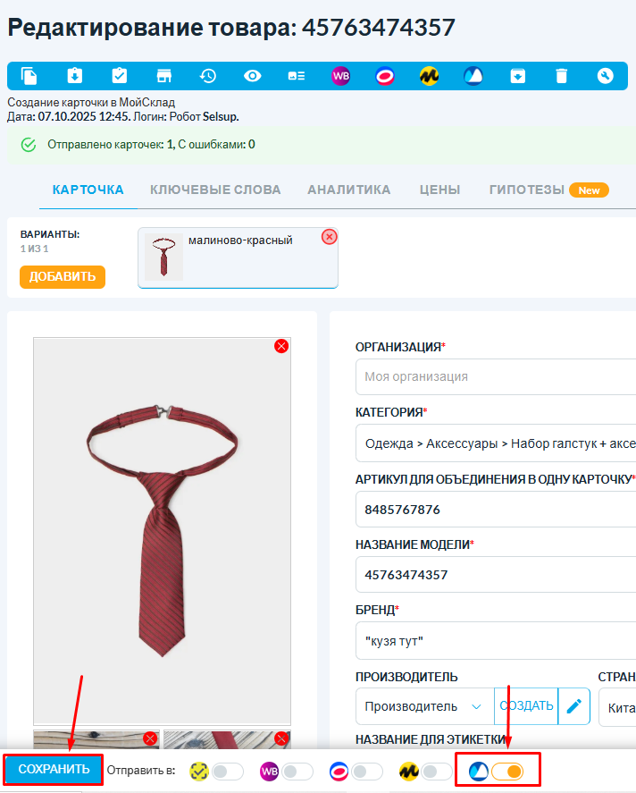 Если товар уже создан в Selsup, но еще не выгружен в МойСклад: