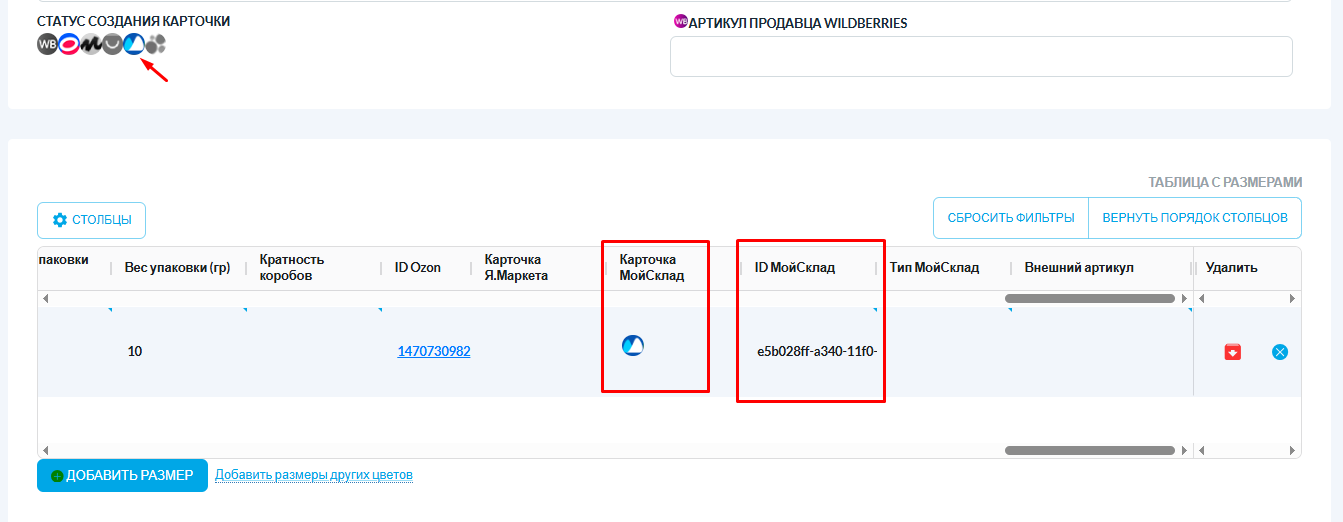 В карточке товара в Selsup появится иконка «МС», подтверждающая синхронизацию.