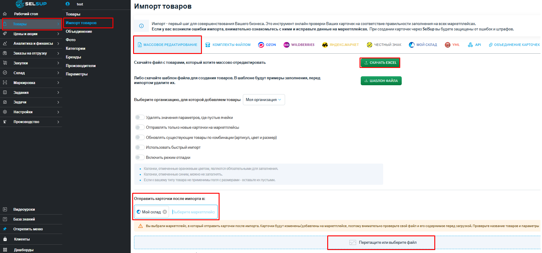 Система импортирует все товары из файла в Selsup и сразу же отправит их в МойСклад, создав там соответствующие карточки.