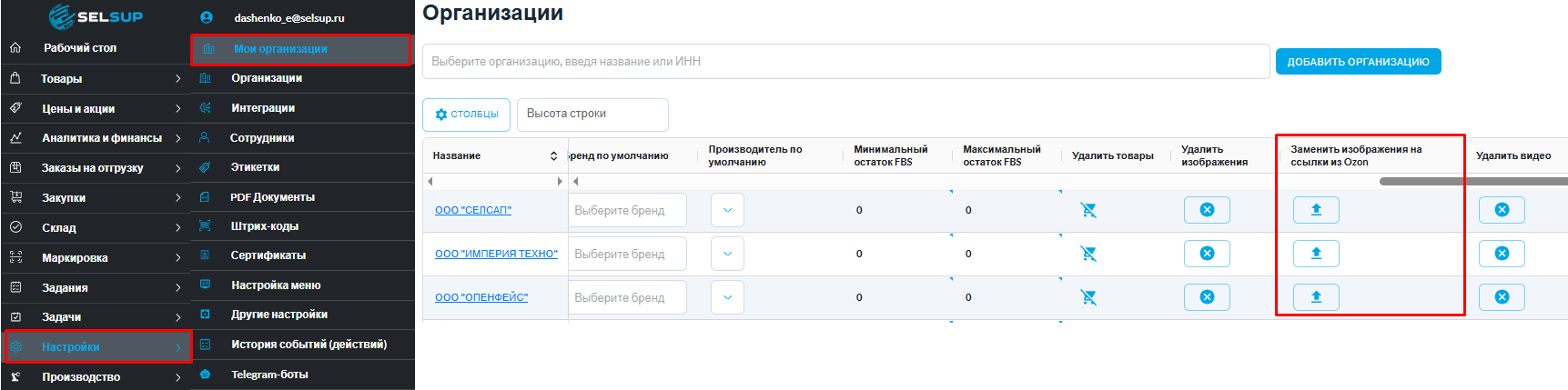 Чтобы заменить их на актуальные изображения из Ozon, перейдите в раздел "Настройки" - "Мои организации".