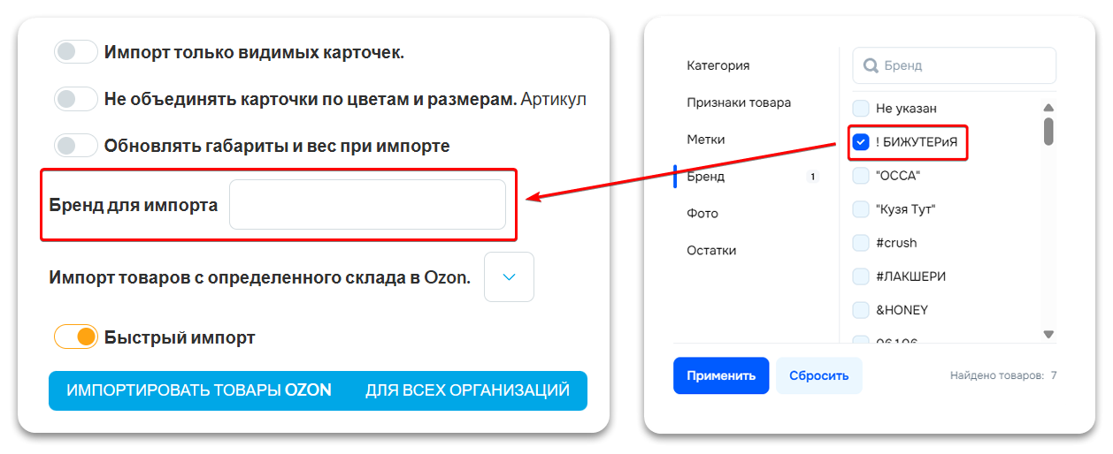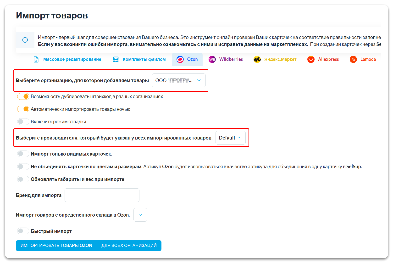 По умолчанию при импорте товаров в SelSup загружаются все товары из вашей библиотеки Ozon, включая товары всех брендов. Если вам нужно импортировать только товары определённых брендов, используйте поле «Бренд для импорта».