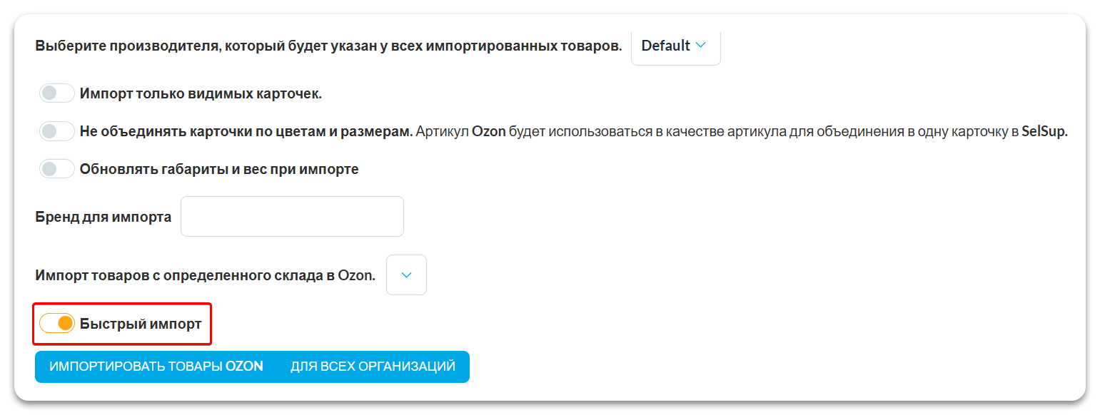 Включите тумблер Быстрый импорт, если вам нужно быстро загрузить новые товары. После включения SelSup будет импортировать только новые позиции, игнорируя уже существующие товары и не обновляя их.