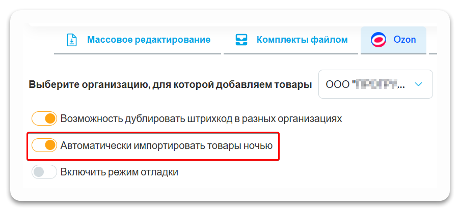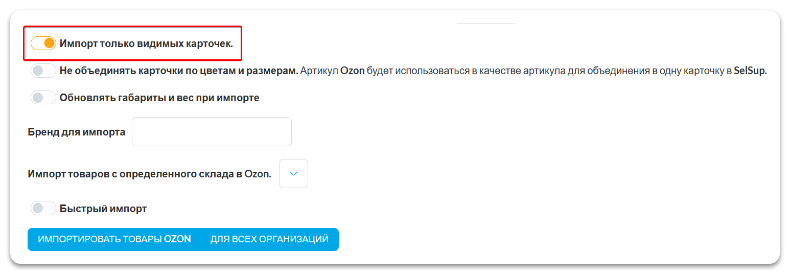 Кнопка позволяет импортировать только те товары, которые доступны на маркетплейсе Ozon в данный момент — без архивных и завершенных позиций. Если эта функция вам необходима, включите соответствующий переключатель.