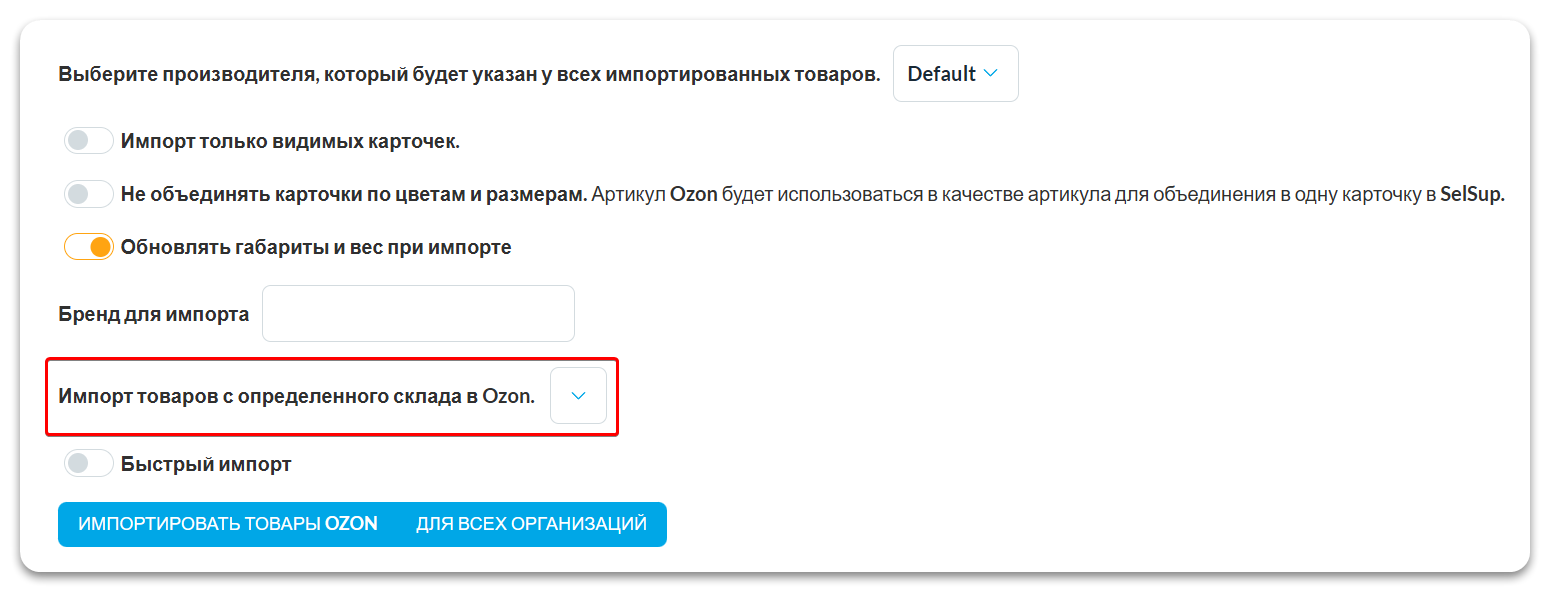 ВверхФункция «Импорт товаров с определенного склада» позволяет импортировать только те товары, которые находятся на выбранном складе, зарегистрированном на Ozon.