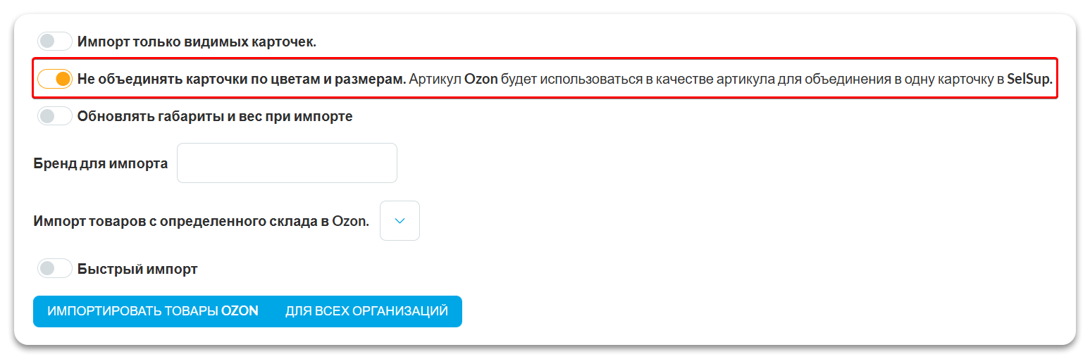 Тумблер «Не объединять карточки по цветам и размерам» позволяет гибко настроить объединение карточек в SelSup, учитывая структуру артикула на Ozon.