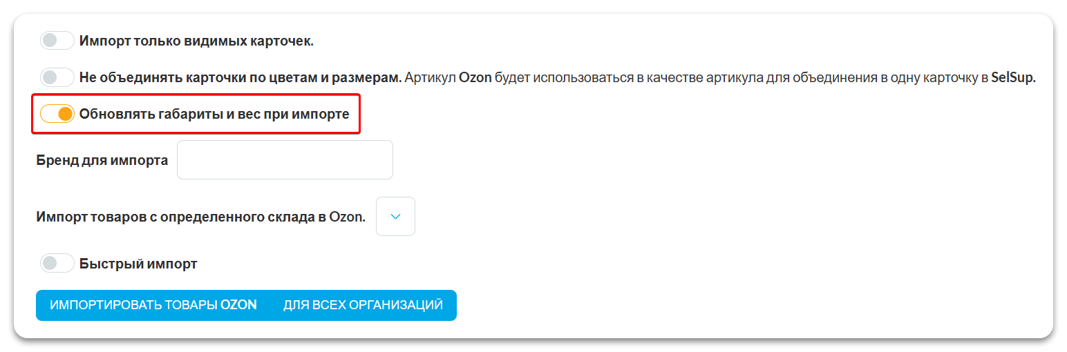 При включении данного тумблера Selsup будет автоматически обновлять габариты и вес товаров при импорте, если они отличаются от данных, указанных на маркетплейсе.
