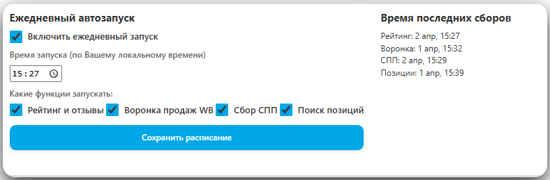 Без функции общего запуска пришлось бы вручную по очереди запускать каждый процесс: отдельно обновлять рейтинг и отзывы, отдельно проверять позиции, отдельно собирать СПП и отдельно загружать данные для воронки продаж.