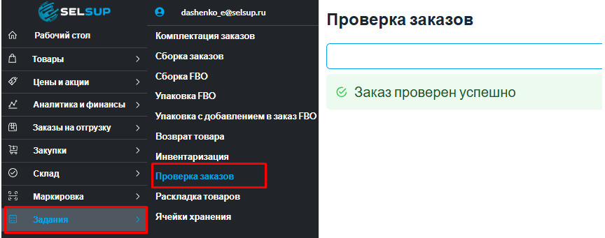 Заказ принят. Если заказ сканируется впервые, на экране появляется сообщение об успешной проверке. SelSup автоматически фиксирует заказ как «Проверенный» и записывает текущую дату и время.