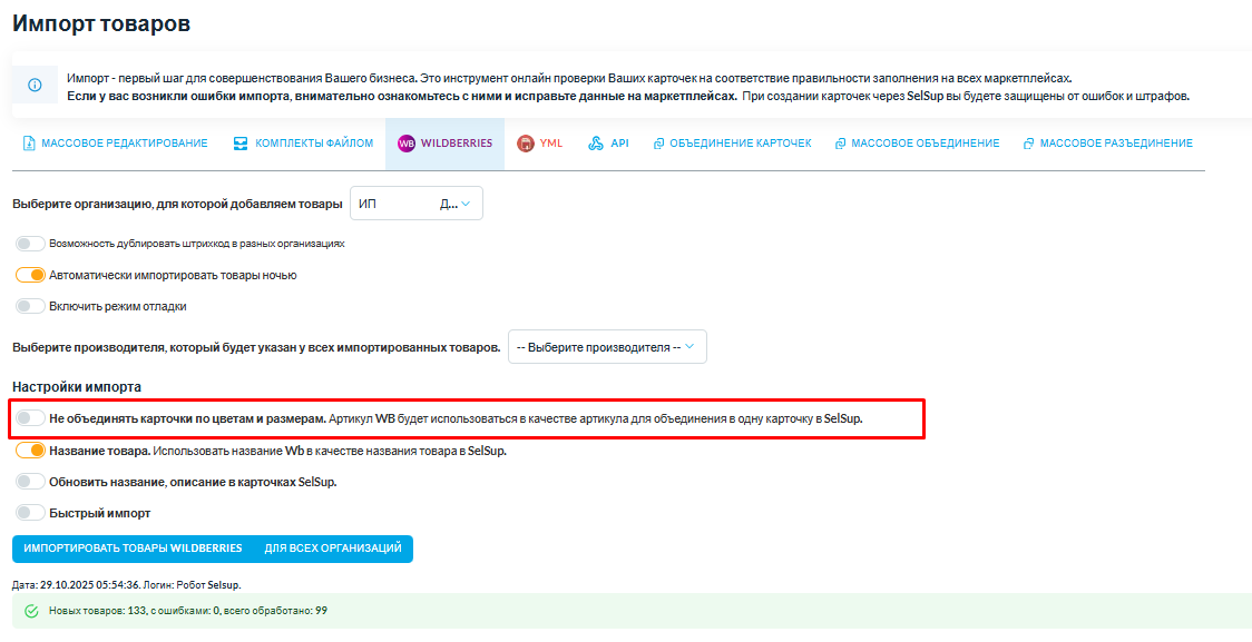 При импорте товаров с маркетплейсов карточки могут автоматически объединиться, собрав в себе несколько цветов или моделей. Это происходит, если во время импорта был включен тумблер «Не объединять карточки по цветам и размерам».