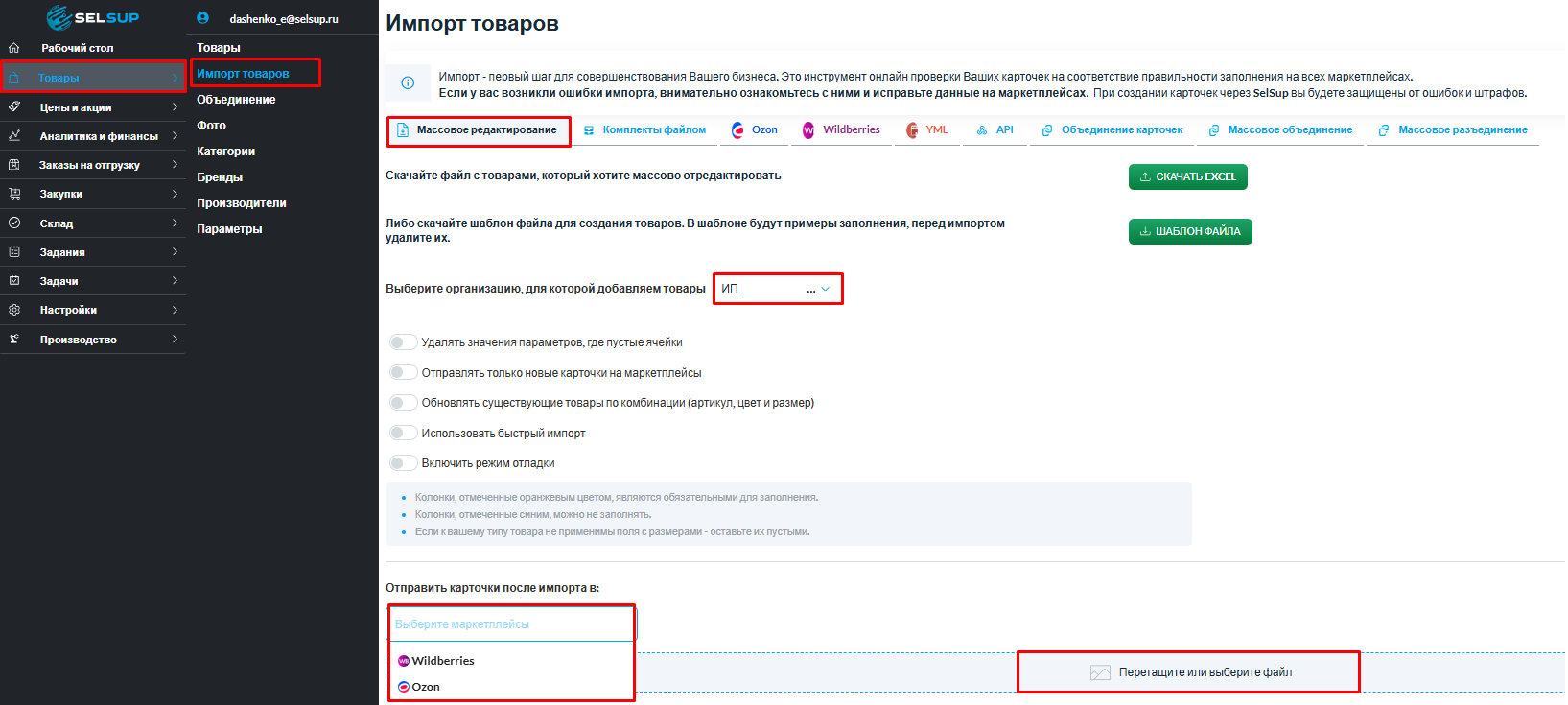 Шаг 6. Вернитесь в Товары - Импорт товаров во вкладку Массовое редактирование. Выберите организацию, для которой добавляете товары, выберите Wildberries и загрузите Excel-файл. Перетащите файл или выберите его нажатием на соответствующее поле.