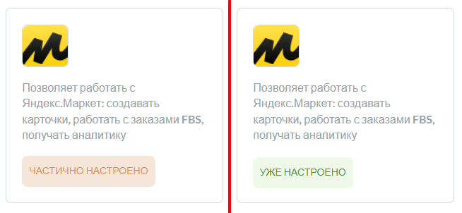 После завершения настройки во вкладке интеграции с маркетплейсом вместо кнопки «Настроить» вы увидите один из статусов: