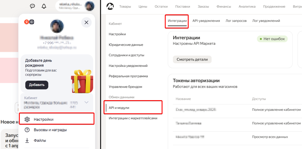 ВверхПерейдите в кабинет Яндекс.Маркета, раздел Настройки — > API и Модули → Интеграции.