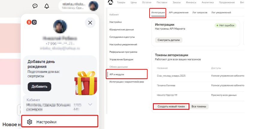 1. Перейдите на страницу Настройки → API и Модули в личном кабинете Яндекс.Маркета и нажмите "Создать новый токен"