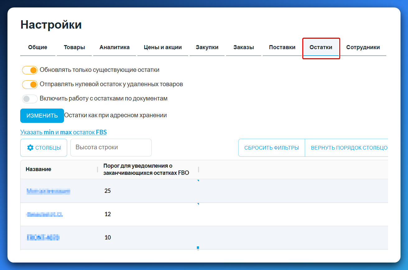 Обновить остатки в товарах - эта кнопка обновляет остаток, который остался на физических складах (FBS) в разделе Товары, колонка «Остаток на ваших складах».