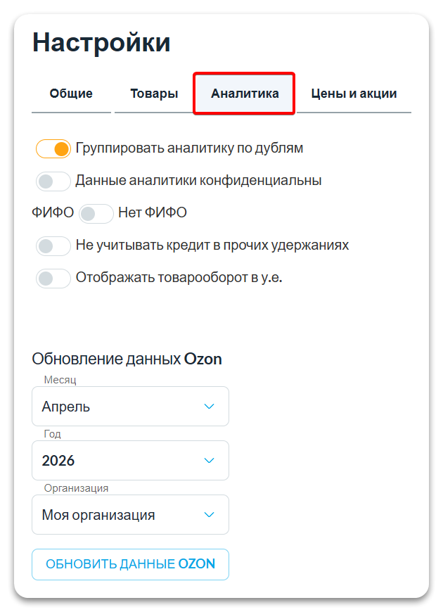 Обновление данных Ozon — этот блок используется для загрузки данных по баллам Ozon, чтобы учитывать их в аналитике. Подробнее читайте в статье о баллах Ozon.