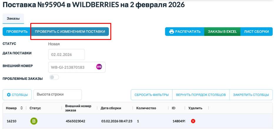 При переходе в поставку Wildberries в разделе Заказы на отгрузку - Поставки можно использовать кнопку «Проверить с изменением поставки». Во время такой проверки SelSup сверяет состав заказов в поставке с данными на Wildberries и, если каких-то заказов уже нет на стороне маркетплейса, уберет их из поставки.
