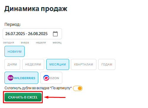 Отчет Вы можете просматривать только в Excel, в разрезе по штрих-коду, цветомодели, артикулу, категории, бренду. Чтобы скачать файл, нажмите «Скачать в Excel», загрузится отчет с динамикой Ваших продаж в штуках и рублях.