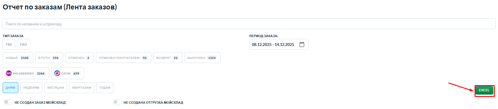 ВверхВы можете скачать отчет в формате Excel. Для этого нажмите кнопку «Excel» под фильтрами.