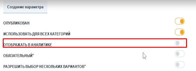 «Параметры → Создание параметра» доступен тумблер «Отображать в аналитике».