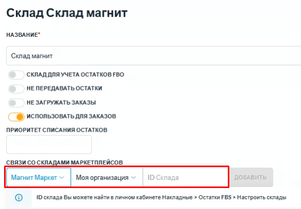 Обратите внимание, что перед тем как связывать склады, на маркетплейсе у вас уже должен быть заведен склад и настроена работа по FBS.