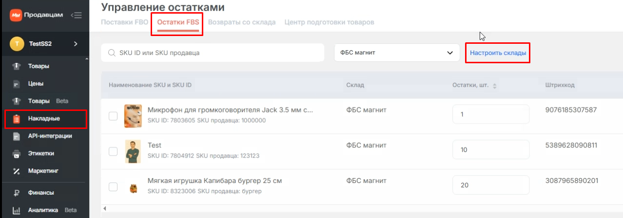1.Перейдите в раздел Накладные → Остатки FBS → Настроить склады.