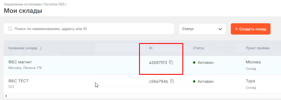 Сначала получите ID склада в личном кабинете Магнит Маркет: