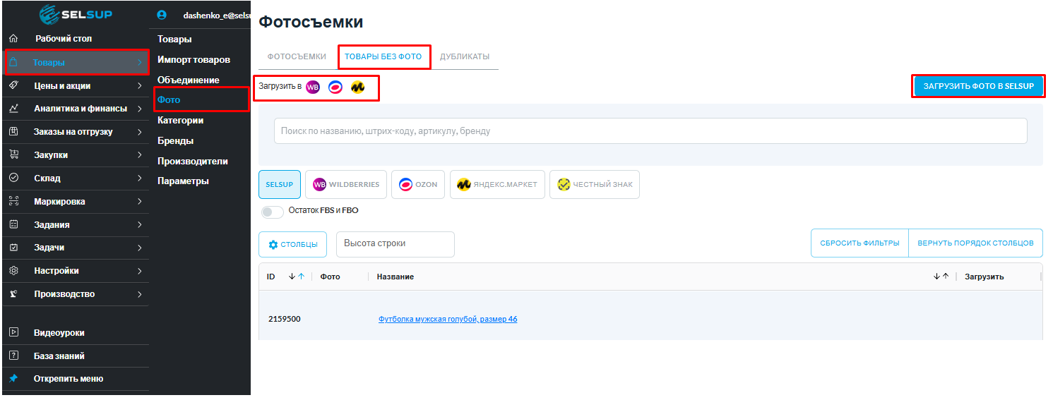 После успешной загрузки в SelSup нажмите на ярлык нужного маркетплейса в поле Загрузить фото в