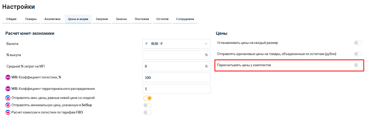 ВверхСебестоимость комплекта автоматически рассчитывается как сумма себестоимостей всех его компонентов. Чтобы включить автоматический пересчет, активируйте тумблер «Пересчитывать цены у комплектов» в разделе Настройки → Цены.