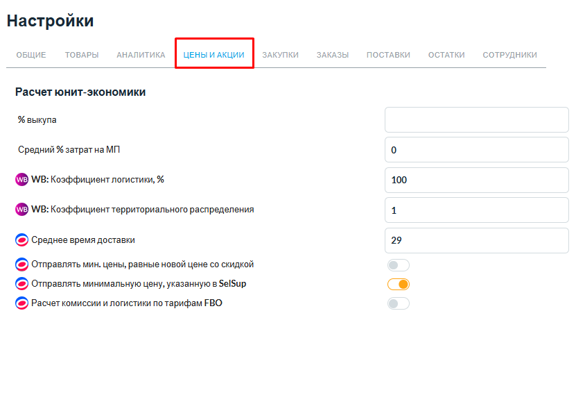 | Процент (%) выкупа | Выгружается из аналитики. Можно ввести вручную. В разделе Товары-Цены процент выкупа будет считаться за весь период. |